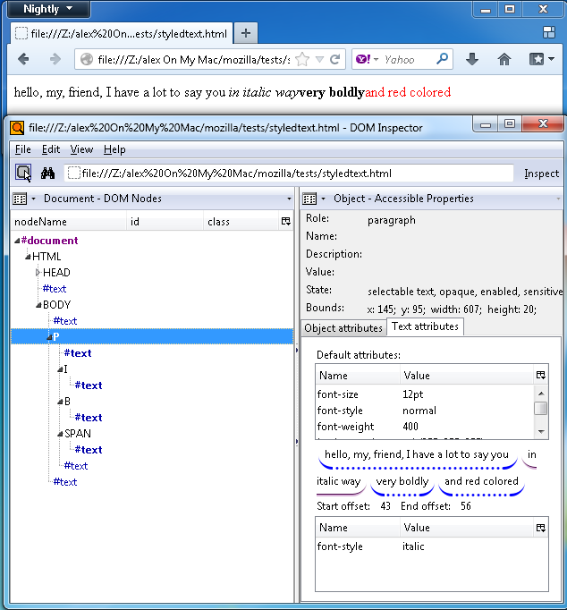then HTML p element is divided into two ranges, the first text range corresponding to 'hello' text has 'font-weight:700' text attribute, the second text range corresponding to 'italic' text exposes 'font-style:italic' text attribute.