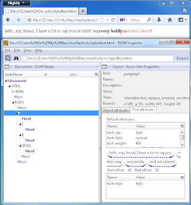 You can see default text attributes for the selected accessible and inspect text attributes and offsets for each text range where text attributes stay permanent. For example if you have